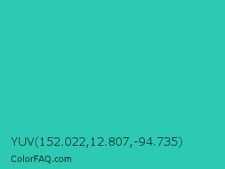 YUV 152.022,12.807,-94.735 Color is a normal cyan color and the nearest color is Maximum Blue Green #30bfbf. Hex code #2ccab2 and RGB value is rgb(44,202,178). In RGB color space, this color is composed of 17% red, 79% green, 70% blue, In CMYK color space, this color is composed of 78% cyan, 0% magenta, 12% yellow , 21% black , In HSL color space, this color has a hue angle of 171° , 64% saturation and 48% lightness.