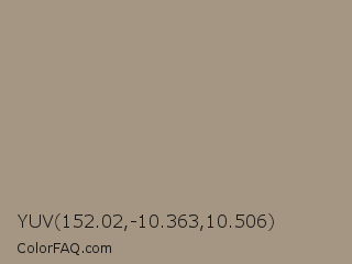 YUV 152.02,-10.363,10.506 Color is a normal orange color and the nearest color is Grullo #a99a86. Hex code #a49683 and RGB value is rgb(164,150,131). In RGB color space, this color is composed of 64% red, 59% green, 51% blue, In CMYK color space, this color is composed of 0% cyan, 9% magenta, 20% yellow , 36% black , In HSL color space, this color has a hue angle of 35° , 15% saturation and 58% lightness.