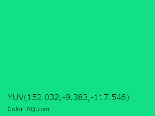YUV 152.032,-9.383,-117.546 Color is a normal green color and the nearest color is Caribbean Green #00cc99. Hex code #12e085 and RGB value is rgb(18,224,133). In RGB color space, this color is composed of 7% red, 88% green, 52% blue, In CMYK color space, this color is composed of 92% cyan, 0% magenta, 41% yellow , 12% black , In HSL color space, this color has a hue angle of 153° , 85% saturation and 47% lightness.