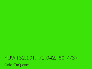 YUV 152.101,-71.042,-80.773 Color is a normal green color and the nearest color is Harlequin #3fff00. Hex code #3ce308 and RGB value is rgb(60,227,8). In RGB color space, this color is composed of 24% red, 89% green, 3% blue, In CMYK color space, this color is composed of 74% cyan, 0% magenta, 96% yellow , 11% black , In HSL color space, this color has a hue angle of 106° , 93% saturation and 46% lightness.