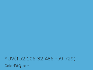 YUV 152.106,32.486,-59.729 Color is a normal blue color and the nearest color is Shakespeare #4eabd1. Hex code #54aeda and RGB value is rgb(84,174,218). In RGB color space, this color is composed of 33% red, 68% green, 85% blue, In CMYK color space, this color is composed of 61% cyan, 20% magenta, 0% yellow , 15% black , In HSL color space, this color has a hue angle of 200° , 64% saturation and 59% lightness.