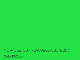 YUV 152.107,-39.986,-101.826 Color is a normal green color and the nearest color is Malachite #0bda51. Hex code #24e347 and RGB value is rgb(36,227,71). In RGB color space, this color is composed of 14% red, 89% green, 28% blue, In CMYK color space, this color is composed of 84% cyan, 0% magenta, 69% yellow , 11% black , In HSL color space, this color has a hue angle of 131° , 77% saturation and 52% lightness.