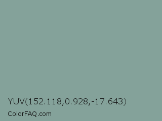 YUV 152.118,0.928,-17.643 Color is a normal cyan color and the nearest color is Granny Smith #84a0a0. Hex code #84a29a and RGB value is rgb(132,162,154). In RGB color space, this color is composed of 52% red, 64% green, 60% blue, In CMYK color space, this color is composed of 19% cyan, 0% magenta, 5% yellow , 36% black , In HSL color space, this color has a hue angle of 164° , 14% saturation and 58% lightness.