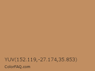 YUV 152.119,-27.174,35.853 Color is a normal orange color and the nearest color is Twine #c2955d. Hex code #c18e61 and RGB value is rgb(193,142,97). In RGB color space, this color is composed of 76% red, 56% green, 38% blue, In CMYK color space, this color is composed of 0% cyan, 26% magenta, 50% yellow , 24% black , In HSL color space, this color has a hue angle of 28° , 44% saturation and 57% lightness.