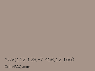 YUV 152.128,-7.458,12.166 Color is a normal orange color and the nearest color is Grullo #a99a86. Hex code #a69489 and RGB value is rgb(166,148,137). In RGB color space, this color is composed of 65% red, 58% green, 54% blue, In CMYK color space, this color is composed of 0% cyan, 11% magenta, 17% yellow , 35% black , In HSL color space, this color has a hue angle of 23° , 14% saturation and 59% lightness.