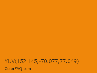 YUV 152.145,-70.077,77.049 Color is a normal orange color and the nearest color is Tangerine #f28500. Hex code #f0870a and RGB value is rgb(240,135,10). In RGB color space, this color is composed of 94% red, 53% green, 4% blue, In CMYK color space, this color is composed of 0% cyan, 44% magenta, 96% yellow , 6% black , In HSL color space, this color has a hue angle of 33° , 92% saturation and 49% lightness.