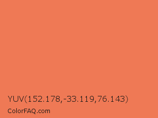 YUV 152.178,-33.119,76.143 Color is a light red color and the nearest color is Burnt Sienna #e97451. Hex code #ef7955 and RGB value is rgb(239,121,85). In RGB color space, this color is composed of 94% red, 47% green, 33% blue, In CMYK color space, this color is composed of 0% cyan, 49% magenta, 64% yellow , 6% black , In HSL color space, this color has a hue angle of 14° , 83% saturation and 64% lightness.