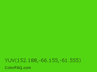 YUV 152.188,-66.155,-61.555 Color is a normal green color and the nearest color is Harlequin Green #46cb18. Hex code #52d612 and RGB value is rgb(82,214,18). In RGB color space, this color is composed of 32% red, 84% green, 7% blue, In CMYK color space, this color is composed of 62% cyan, 0% magenta, 92% yellow , 16% black , In HSL color space, this color has a hue angle of 100° , 84% saturation and 45% lightness.
