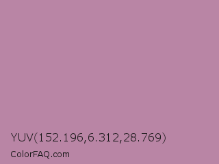 YUV 152.196,6.312,28.769 Color is a light magenta color and the nearest color is Opera Mauve #b784a7. Hex code #b985a5 and RGB value is rgb(185,133,165). In RGB color space, this color is composed of 73% red, 52% green, 65% blue, In CMYK color space, this color is composed of 0% cyan, 28% magenta, 11% yellow , 27% black , In HSL color space, this color has a hue angle of 323° , 27% saturation and 62% lightness.