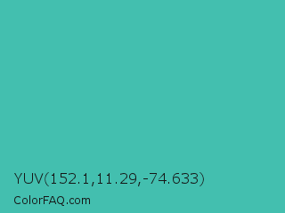 YUV 152.1,11.29,-74.633 Color is a normal cyan color and the nearest color is Puerto Rico #3fc1aa. Hex code #43bfaf and RGB value is rgb(67,191,175). In RGB color space, this color is composed of 26% red, 75% green, 69% blue, In CMYK color space, this color is composed of 65% cyan, 0% magenta, 8% yellow , 25% black , In HSL color space, this color has a hue angle of 172° , 49% saturation and 51% lightness.