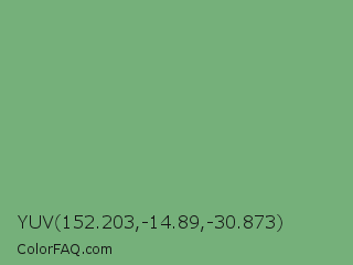 YUV 152.203,-14.89,-30.873 Color is a normal green color and the nearest color is Iguana Green #71bc78. Hex code #75b07a and RGB value is rgb(117,176,122). In RGB color space, this color is composed of 46% red, 69% green, 48% blue, In CMYK color space, this color is composed of 34% cyan, 0% magenta, 31% yellow , 31% black , In HSL color space, this color has a hue angle of 125° , 27% saturation and 57% lightness.