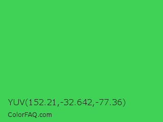 YUV 152.21,-32.642,-77.36 Color is a normal green color and the nearest color is UFO Green #3cd070. Hex code #40d256 and RGB value is rgb(64,210,86). In RGB color space, this color is composed of 25% red, 82% green, 34% blue, In CMYK color space, this color is composed of 70% cyan, 0% magenta, 59% yellow , 18% black , In HSL color space, this color has a hue angle of 129° , 62% saturation and 54% lightness.