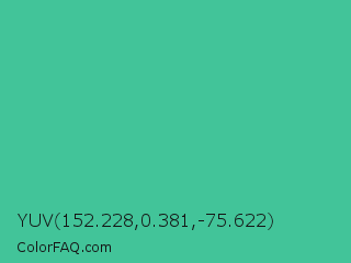 YUV 152.228,0.381,-75.622 Color is a normal green color and the nearest color is Ocean Green #48bf91. Hex code #42c499 and RGB value is rgb(66,196,153). In RGB color space, this color is composed of 26% red, 77% green, 60% blue, In CMYK color space, this color is composed of 66% cyan, 0% magenta, 22% yellow , 23% black , In HSL color space, this color has a hue angle of 160° , 52% saturation and 51% lightness.