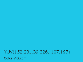 YUV 152.231,39.326,-107.197 Color is a normal cyan color and the nearest color is Spiro Disco Ball #0fc0fc. Hex code #1ec7e8 and RGB value is rgb(30,199,232). In RGB color space, this color is composed of 12% red, 78% green, 91% blue, In CMYK color space, this color is composed of 87% cyan, 14% magenta, 0% yellow , 9% black , In HSL color space, this color has a hue angle of 190° , 81% saturation and 51% lightness.