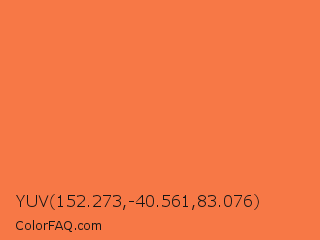 YUV 152.273,-40.561,83.076 Color is a light orange color and the nearest color is Mandarin #f37a48. Hex code #f77846 and RGB value is rgb(247,120,70). In RGB color space, this color is composed of 97% red, 47% green, 27% blue, In CMYK color space, this color is composed of 0% cyan, 51% magenta, 72% yellow , 3% black , In HSL color space, this color has a hue angle of 17° , 92% saturation and 62% lightness.