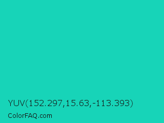 YUV 152.297,15.63,-113.393 Color is a normal cyan color and the nearest color is Java #1fc2c2. Hex code #17d4b8 and RGB value is rgb(23,212,184). In RGB color space, this color is composed of 9% red, 83% green, 72% blue, In CMYK color space, this color is composed of 89% cyan, 0% magenta, 13% yellow , 17% black , In HSL color space, this color has a hue angle of 171° , 80% saturation and 46% lightness.