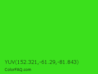 YUV 152.321,-61.29,-81.843 Color is a normal green color and the nearest color is Harlequin Green #46cb18. Hex code #3be01c and RGB value is rgb(59,224,28). In RGB color space, this color is composed of 23% red, 88% green, 11% blue, In CMYK color space, this color is composed of 74% cyan, 0% magenta, 88% yellow , 12% black , In HSL color space, this color has a hue angle of 111° , 78% saturation and 49% lightness.