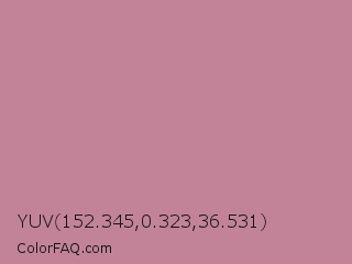 YUV 152.345,0.323,36.531 Color is a light rose color and the nearest color is Puce #cc8899. Hex code #c28399 and RGB value is rgb(194,131,153). In RGB color space, this color is composed of 76% red, 51% green, 60% blue, In CMYK color space, this color is composed of 0% cyan, 32% magenta, 21% yellow , 24% black , In HSL color space, this color has a hue angle of 339° , 34% saturation and 64% lightness.