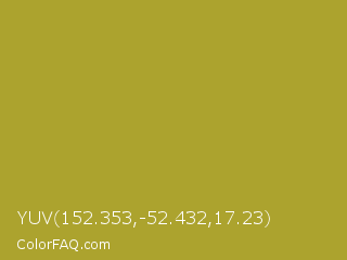 YUV 152.353,-52.432,17.23 Color is a normal yellow color and the nearest color is Lemon Ginger #ac9e22. Hex code #aca32e and RGB value is rgb(172,163,46). In RGB color space, this color is composed of 67% red, 64% green, 18% blue, In CMYK color space, this color is composed of 0% cyan, 5% magenta, 73% yellow , 33% black , In HSL color space, this color has a hue angle of 56° , 58% saturation and 43% lightness.