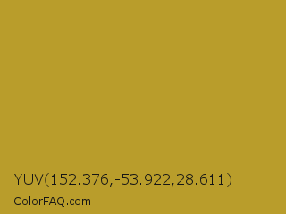 YUV 152.376,-53.922,28.611 Color is a normal yellow color and the nearest color is Nugget #c59922. Hex code #b99d2b and RGB value is rgb(185,157,43). In RGB color space, this color is composed of 73% red, 62% green, 17% blue, In CMYK color space, this color is composed of 0% cyan, 15% magenta, 77% yellow , 27% black , In HSL color space, this color has a hue angle of 48° , 62% saturation and 45% lightness.