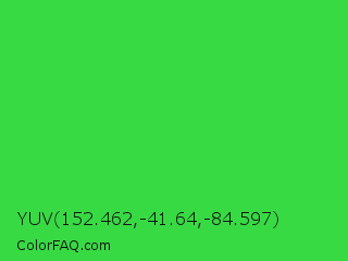 YUV 152.462,-41.64,-84.597 Color is a normal green color and the nearest color is Lime Green #32cd32. Hex code #38da44 and RGB value is rgb(56,218,68). In RGB color space, this color is composed of 22% red, 85% green, 27% blue, In CMYK color space, this color is composed of 74% cyan, 0% magenta, 69% yellow , 15% black , In HSL color space, this color has a hue angle of 124° , 69% saturation and 54% lightness.