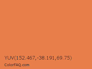YUV 152.467,-38.191,69.75 Color is a normal orange color and the nearest color is Mandarin #f37a48. Hex code #e87f4b and RGB value is rgb(232,127,75). In RGB color space, this color is composed of 91% red, 50% green, 29% blue, In CMYK color space, this color is composed of 0% cyan, 45% magenta, 68% yellow , 9% black , In HSL color space, this color has a hue angle of 20° , 77% saturation and 60% lightness.
