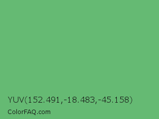 YUV 152.491,-18.483,-45.158 Color is a normal green color and the nearest color is Fern #63b76c. Hex code #65ba73 and RGB value is rgb(101,186,115). In RGB color space, this color is composed of 40% red, 73% green, 45% blue, In CMYK color space, this color is composed of 46% cyan, 0% magenta, 38% yellow , 27% black , In HSL color space, this color has a hue angle of 130° , 38% saturation and 56% lightness.