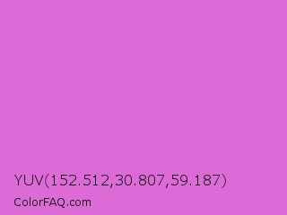 YUV 152.512,30.807,59.187 Color is a light magenta color and the nearest color is Orchid #da70d6. Hex code #dc6ad7 and RGB value is rgb(220,106,215). In RGB color space, this color is composed of 86% red, 42% green, 84% blue, In CMYK color space, this color is composed of 0% cyan, 52% magenta, 2% yellow , 14% black , In HSL color space, this color has a hue angle of 303° , 62% saturation and 64% lightness.