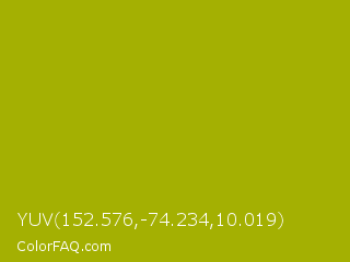 YUV 152.576,-74.234,10.019 Color is a normal yellow color and the nearest color is Pistachio Green #9dc209. Hex code #a4b002 and RGB value is rgb(164,176,2). In RGB color space, this color is composed of 64% red, 69% green, 1% blue, In CMYK color space, this color is composed of 7% cyan, 0% magenta, 99% yellow , 31% black , In HSL color space, this color has a hue angle of 64° , 98% saturation and 35% lightness.