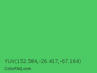 YUV 152.584,-26.417,-67.164 Color is a normal green color and the nearest color is UFO Green #3cd070. Hex code #4cca63 and RGB value is rgb(76,202,99). In RGB color space, this color is composed of 30% red, 79% green, 39% blue, In CMYK color space, this color is composed of 62% cyan, 0% magenta, 51% yellow , 21% black , In HSL color space, this color has a hue angle of 131° , 54% saturation and 55% lightness.