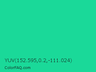 YUV 152.595,0.2,-111.024 Color is a normal green color and the nearest color is Shamrock #33cc99. Hex code #1ad999 and RGB value is rgb(26,217,153). In RGB color space, this color is composed of 10% red, 85% green, 60% blue, In CMYK color space, this color is composed of 88% cyan, 0% magenta, 29% yellow , 15% black , In HSL color space, this color has a hue angle of 160° , 79% saturation and 48% lightness.