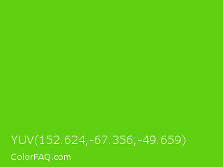 YUV 152.624,-67.356,-49.659 Color is a normal green color and the nearest color is Harlequin Green #46cb18. Hex code #60d010 and RGB value is rgb(96,208,16). In RGB color space, this color is composed of 38% red, 82% green, 6% blue, In CMYK color space, this color is composed of 54% cyan, 0% magenta, 92% yellow , 18% black , In HSL color space, this color has a hue angle of 95° , 86% saturation and 44% lightness.