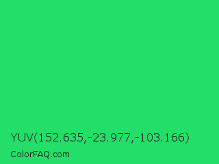YUV 152.635,-23.977,-103.166 Color is a normal green color and the nearest color is UFO Green #3cd070. Hex code #23de68 and RGB value is rgb(35,222,104). In RGB color space, this color is composed of 14% red, 87% green, 41% blue, In CMYK color space, this color is composed of 84% cyan, 0% magenta, 53% yellow , 13% black , In HSL color space, this color has a hue angle of 142° , 74% saturation and 50% lightness.