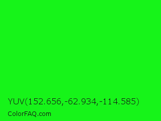 YUV 152.656,-62.934,-114.585 Color is a normal green color and the nearest color is Green #00ff00. Hex code #16f419 and RGB value is rgb(22,244,25). In RGB color space, this color is composed of 9% red, 96% green, 10% blue, In CMYK color space, this color is composed of 91% cyan, 0% magenta, 90% yellow , 4% black , In HSL color space, this color has a hue angle of 121° , 91% saturation and 52% lightness.