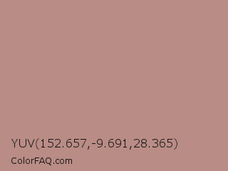 YUV 152.657,-9.691,28.365 Color is a light red color and the nearest color is Brandy Rose #bb8983. Hex code #b98c85 and RGB value is rgb(185,140,133). In RGB color space, this color is composed of 73% red, 55% green, 52% blue, In CMYK color space, this color is composed of 0% cyan, 24% magenta, 28% yellow , 27% black , In HSL color space, this color has a hue angle of 8° , 27% saturation and 62% lightness.