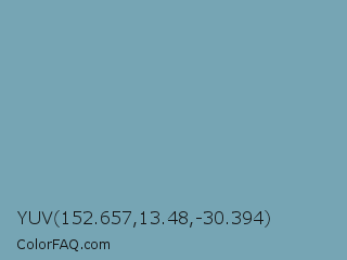 YUV 152.657,13.48,-30.394 Color is a normal blue color and the nearest color is Air Superiority Blue #72a0c1. Hex code #76a5b4 and RGB value is rgb(118,165,180). In RGB color space, this color is composed of 46% red, 65% green, 71% blue, In CMYK color space, this color is composed of 34% cyan, 8% magenta, 0% yellow , 29% black , In HSL color space, this color has a hue angle of 195° , 29% saturation and 58% lightness.