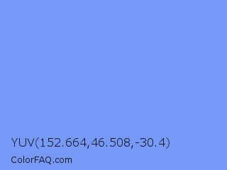 YUV 152.664,46.508,-30.4 Color is a light blue color and the nearest color is Cornflower Blue #6495ed. Hex code #7698f7 and RGB value is rgb(118,152,247). In RGB color space, this color is composed of 46% red, 60% green, 97% blue, In CMYK color space, this color is composed of 52% cyan, 38% magenta, 0% yellow , 3% black , In HSL color space, this color has a hue angle of 224° , 89% saturation and 72% lightness.