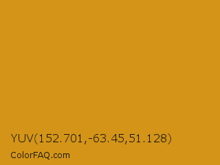 YUV 152.701,-63.45,51.128 Color is a normal orange color and the nearest color is Geebung #d18f1b. Hex code #d39418 and RGB value is rgb(211,148,24). In RGB color space, this color is composed of 83% red, 58% green, 9% blue, In CMYK color space, this color is composed of 0% cyan, 30% magenta, 89% yellow , 17% black , In HSL color space, this color has a hue angle of 40° , 80% saturation and 46% lightness.