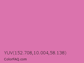 YUV 152.708,10.004,58.138 Color is a light magenta color and the nearest color is Sky Magenta #cf71af. Hex code #db73ad and RGB value is rgb(219,115,173). In RGB color space, this color is composed of 86% red, 45% green, 68% blue, In CMYK color space, this color is composed of 0% cyan, 47% magenta, 21% yellow , 14% black , In HSL color space, this color has a hue angle of 327° , 59% saturation and 65% lightness.