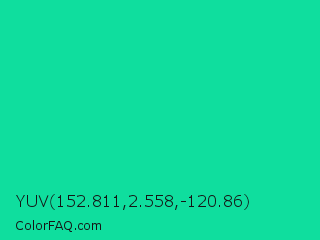 YUV 152.811,2.558,-120.86 Color is a normal green color and the nearest color is Caribbean Green #00cc99. Hex code #0fde9e and RGB value is rgb(15,222,158). In RGB color space, this color is composed of 6% red, 87% green, 62% blue, In CMYK color space, this color is composed of 93% cyan, 0% magenta, 29% yellow , 13% black , In HSL color space, this color has a hue angle of 161° , 87% saturation and 46% lightness.