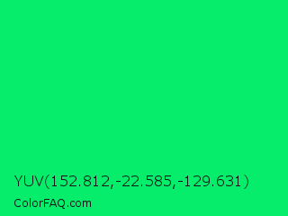 YUV 152.812,-22.585,-129.631 Color is a normal green color and the nearest color is Spring Green #00ff7f. Hex code #05ed6b and RGB value is rgb(5,237,107). In RGB color space, this color is composed of 2% red, 93% green, 42% blue, In CMYK color space, this color is composed of 98% cyan, 0% magenta, 55% yellow , 7% black , In HSL color space, this color has a hue angle of 146° , 96% saturation and 47% lightness.