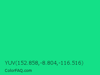 YUV 152.858,-8.804,-116.516 Color is a normal green color and the nearest color is Caribbean Green #00cc99. Hex code #14e087 and RGB value is rgb(20,224,135). In RGB color space, this color is composed of 8% red, 88% green, 53% blue, In CMYK color space, this color is composed of 91% cyan, 0% magenta, 40% yellow , 12% black , In HSL color space, this color has a hue angle of 154° , 84% saturation and 48% lightness.