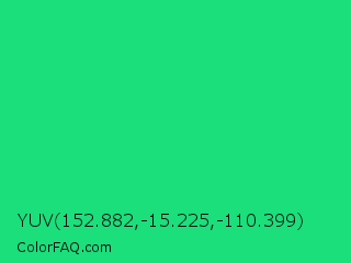 YUV 152.882,-15.225,-110.399 Color is a normal green color and the nearest color is UFO Green #3cd070. Hex code #1bdf7a and RGB value is rgb(27,223,122). In RGB color space, this color is composed of 11% red, 87% green, 48% blue, In CMYK color space, this color is composed of 88% cyan, 0% magenta, 45% yellow , 13% black , In HSL color space, this color has a hue angle of 149° , 78% saturation and 49% lightness.
