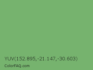 YUV 152.895,-21.147,-30.603 Color is a normal green color and the nearest color is Bud Green #7bb661. Hex code #76b36e and RGB value is rgb(118,179,110). In RGB color space, this color is composed of 46% red, 70% green, 43% blue, In CMYK color space, this color is composed of 34% cyan, 0% magenta, 39% yellow , 30% black , In HSL color space, this color has a hue angle of 113° , 31% saturation and 57% lightness.