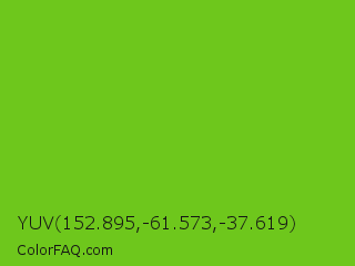 YUV 152.895,-61.573,-37.619 Color is a normal green color and the nearest color is Lima #76bd17. Hex code #6ec71c and RGB value is rgb(110,199,28). In RGB color space, this color is composed of 43% red, 78% green, 11% blue, In CMYK color space, this color is composed of 45% cyan, 0% magenta, 86% yellow , 22% black , In HSL color space, this color has a hue angle of 91° , 75% saturation and 45% lightness.