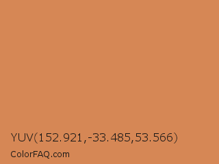 YUV 152.921,-33.485,53.566 Color is a normal orange color and the nearest color is Raw Sienna #d68a59. Hex code #d68755 and RGB value is rgb(214,135,85). In RGB color space, this color is composed of 84% red, 53% green, 33% blue, In CMYK color space, this color is composed of 0% cyan, 37% magenta, 60% yellow , 16% black , In HSL color space, this color has a hue angle of 23° , 61% saturation and 59% lightness.
