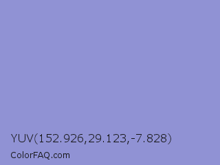 YUV 152.926,29.123,-7.828 Color is a light blue color and the nearest color is Blue Bell Crayola #9999cc. Hex code #9092d4 and RGB value is rgb(144,146,212). In RGB color space, this color is composed of 56% red, 57% green, 83% blue, In CMYK color space, this color is composed of 32% cyan, 31% magenta, 0% yellow , 17% black , In HSL color space, this color has a hue angle of 238° , 44% saturation and 70% lightness.