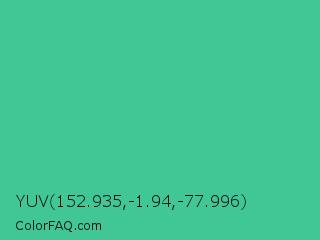 YUV 152.935,-1.94,-77.996 Color is a normal green color and the nearest color is Ocean Green #48bf91. Hex code #40c795 and RGB value is rgb(64,199,149). In RGB color space, this color is composed of 25% red, 78% green, 58% blue, In CMYK color space, this color is composed of 68% cyan, 0% magenta, 25% yellow , 22% black , In HSL color space, this color has a hue angle of 158° , 55% saturation and 52% lightness.