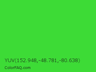YUV 152.948,-48.781,-80.638 Color is a normal green color and the nearest color is Lime Green #32cd32. Hex code #3ddb36 and RGB value is rgb(61,219,54). In RGB color space, this color is composed of 24% red, 86% green, 21% blue, In CMYK color space, this color is composed of 72% cyan, 0% magenta, 75% yellow , 14% black , In HSL color space, this color has a hue angle of 117° , 70% saturation and 54% lightness.