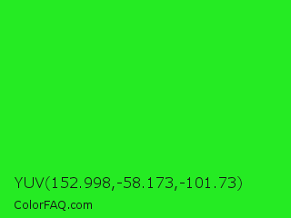 YUV 152.998,-58.173,-101.73 Color is a normal green color and the nearest color is Neon Green #39ff14. Hex code #25eb23 and RGB value is rgb(37,235,35). In RGB color space, this color is composed of 15% red, 92% green, 14% blue, In CMYK color space, this color is composed of 84% cyan, 0% magenta, 85% yellow , 8% black , In HSL color space, this color has a hue angle of 119° , 83% saturation and 53% lightness.